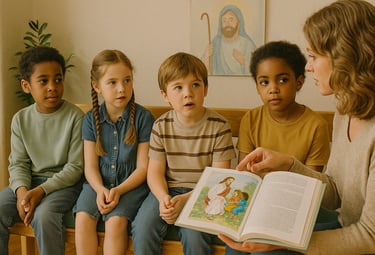 Les enfants découvrent les histoires bibliques à travers des récits interactifs et des saynètes jouées ensemble. Chaque passage de la Bible est raconté de manière vivante et adaptée à leur âge, leur permettant d’assimiler les valeurs chrétiennes de manière concrète et joyeuse.